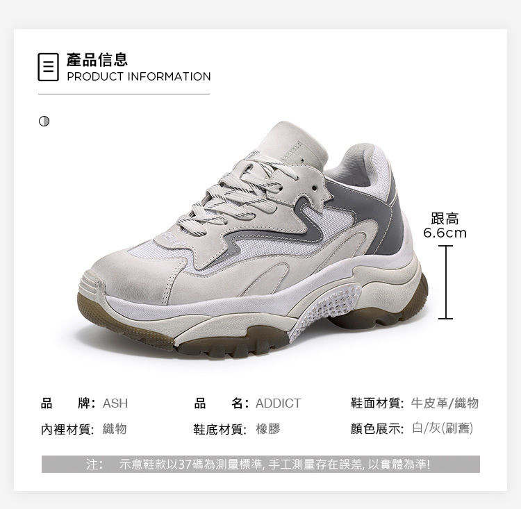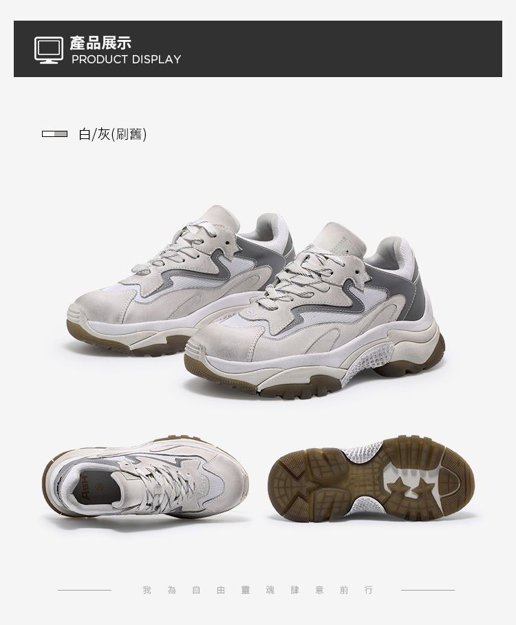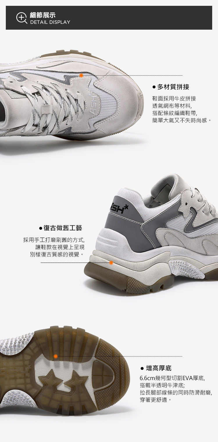 ・手工刷舊率性時尚 ・年度銷售冠軍老爹鞋 ・6.6cm內增高拉長比例 ・全真皮打造細膩親膚