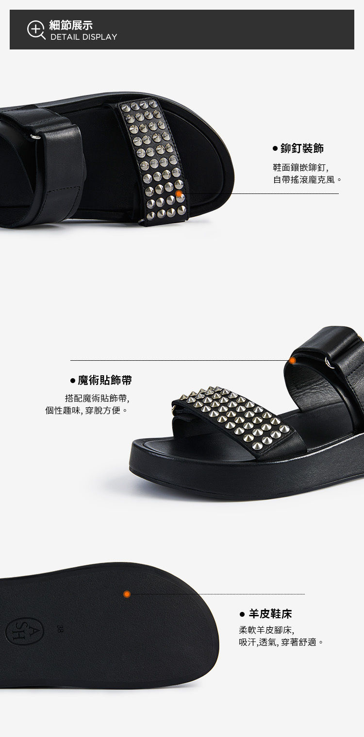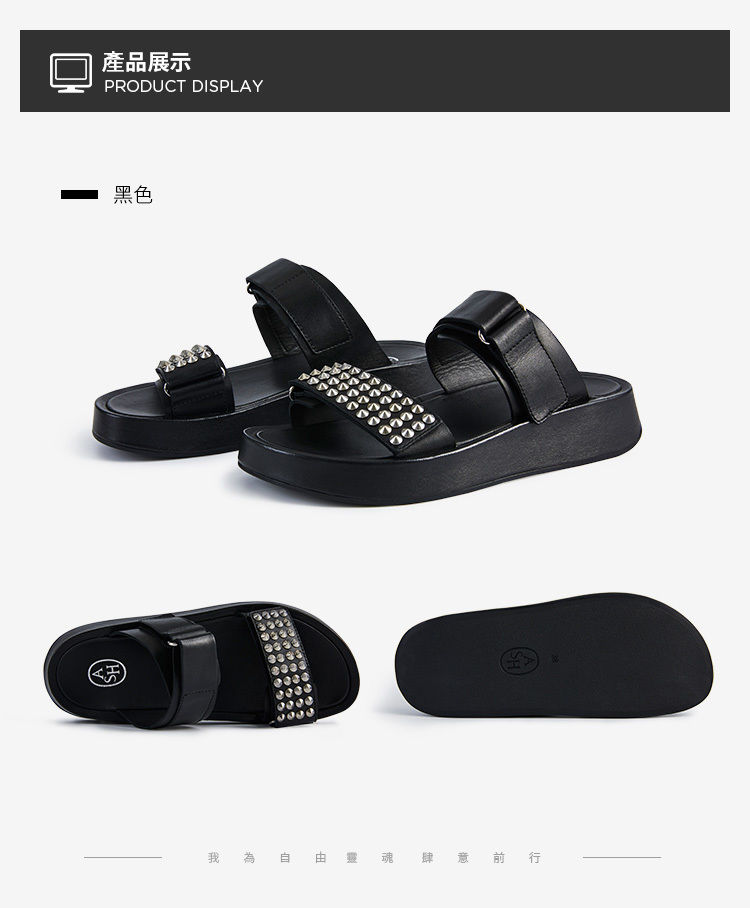 ・全牛皮打造 ・個性鉚釘裝飾 ・夏季新款涼拖鞋 ・4公分厚底