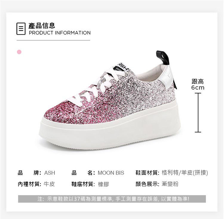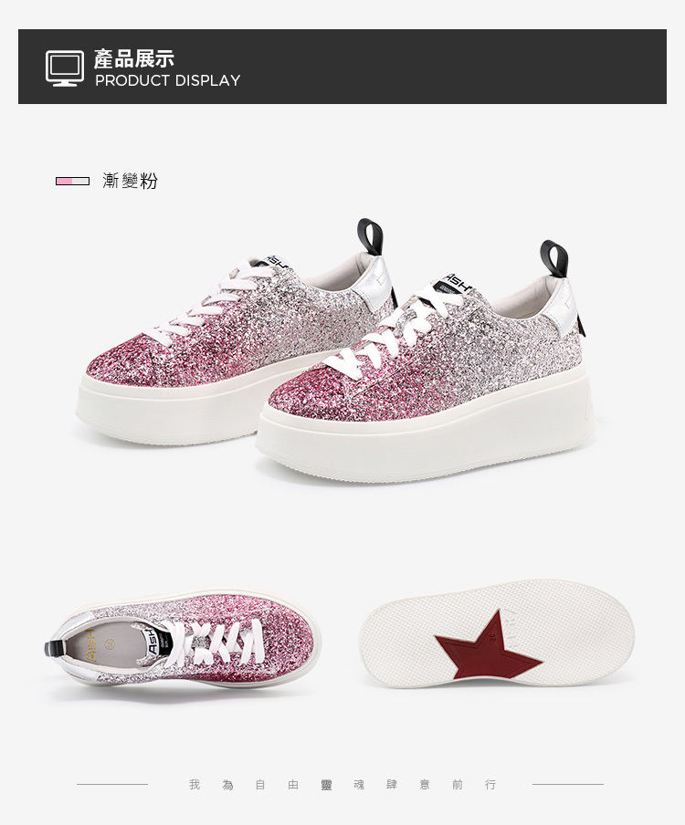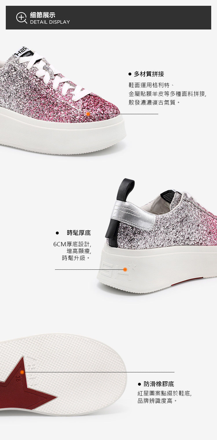 ・6公分厚底顯高顯瘦 ・鞋底星星圖案點綴 ・輕量材質隨穿隨走 ・閃亮格利特鞋面