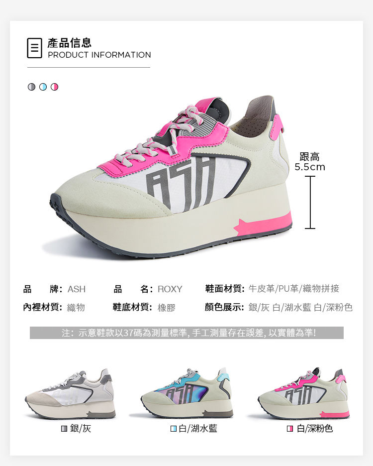 ・鞋身牛反絨面料 ・5.5CM內增高厚底 ・織物超透氣內裡 ・防滑耐磨橡膠大底