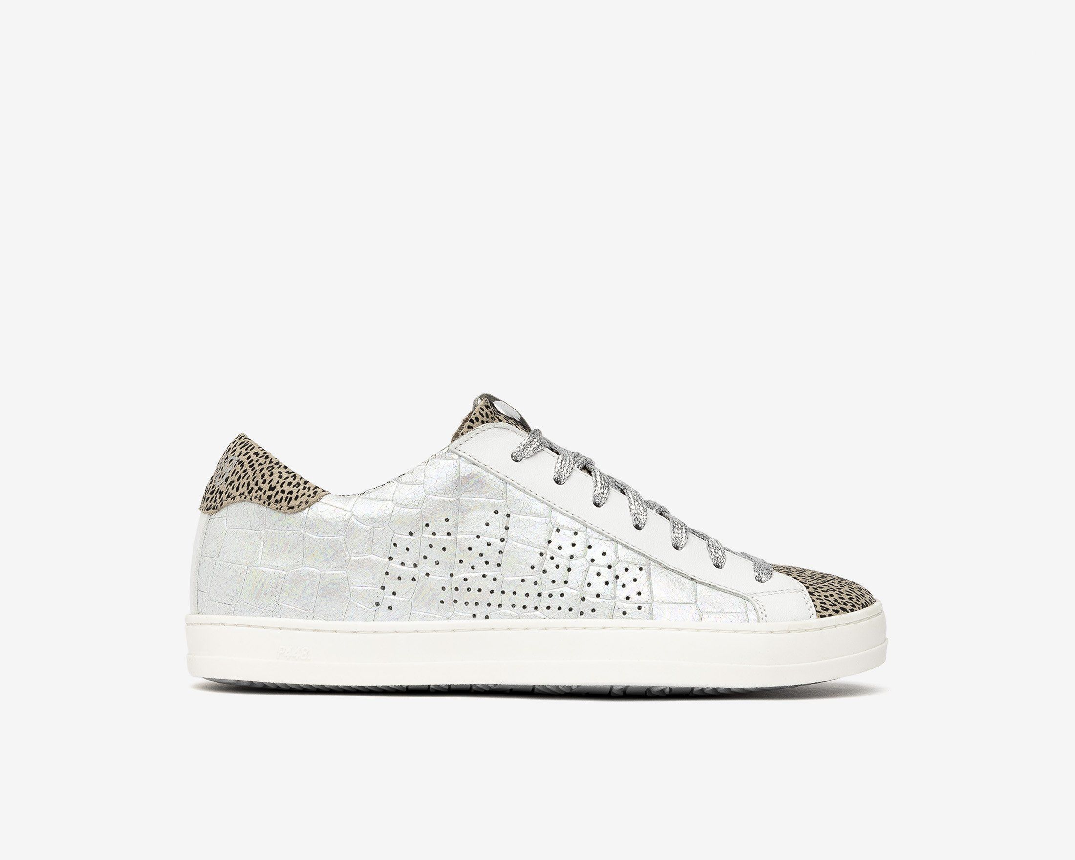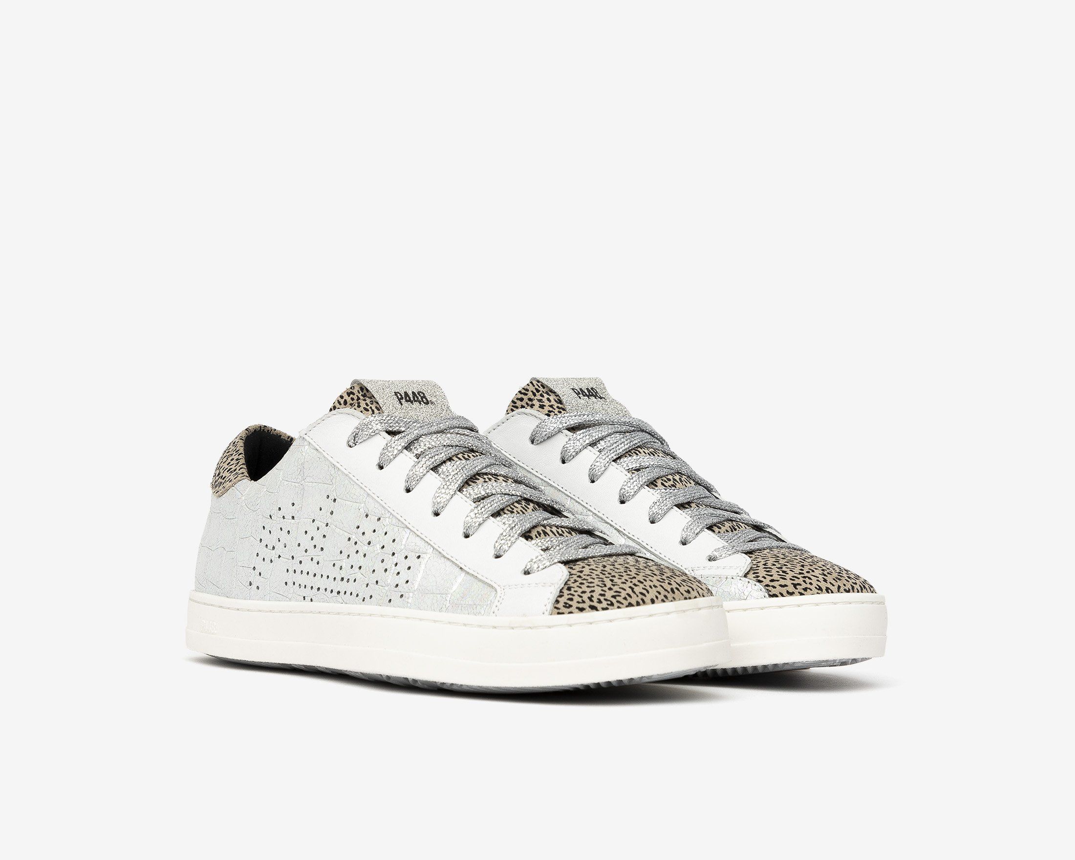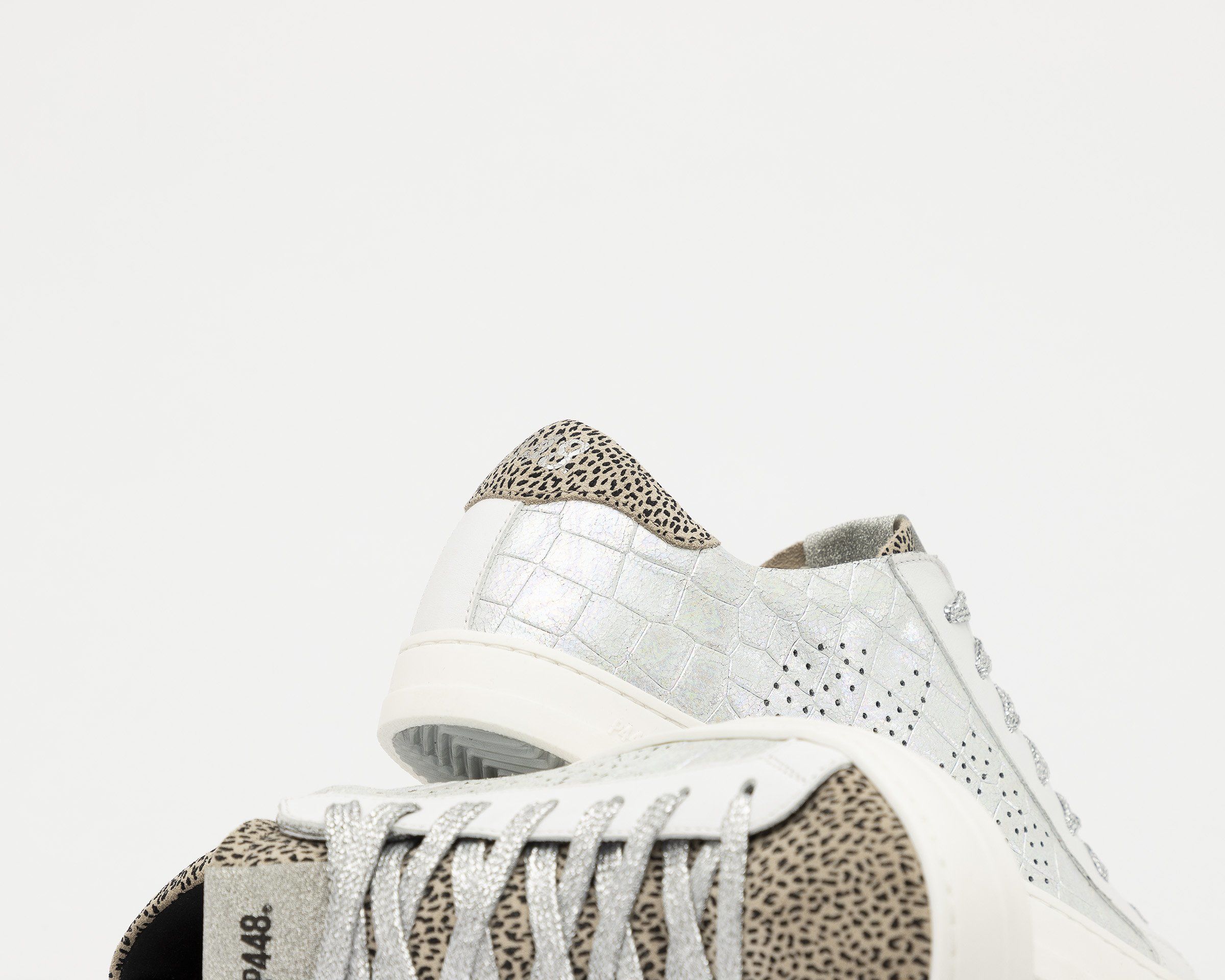 •100%義大利製造 •白色牛皮革 •品牌豹紋絨 •銀色綁帶 •P448訂製記憶鞋墊 •跟高2.3公分 •正常版型