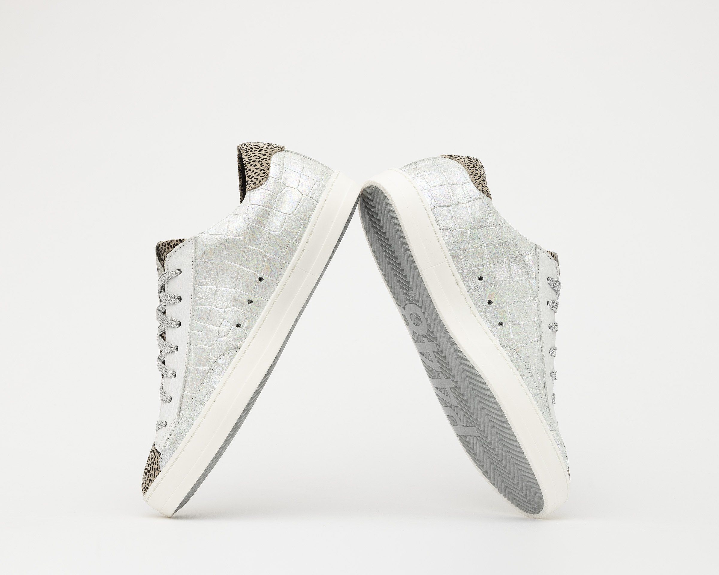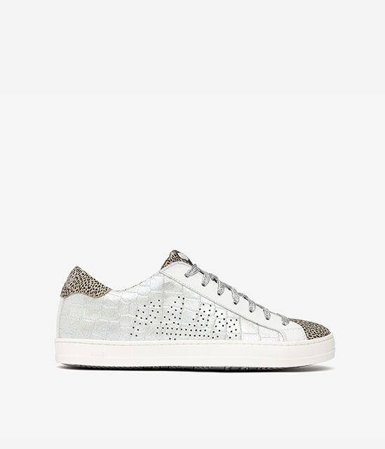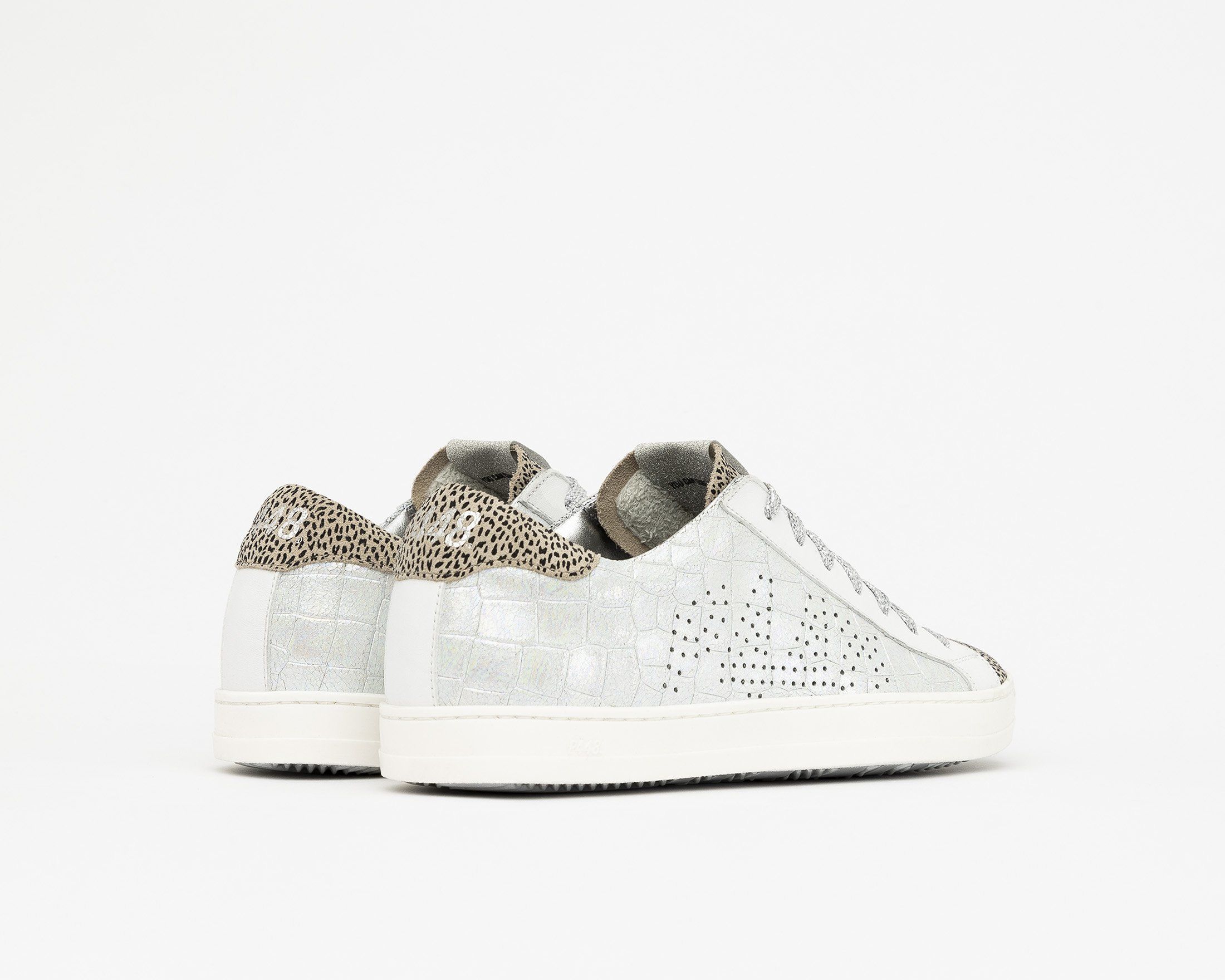 •100%義大利製造 •白色牛皮革 •品牌豹紋絨 •銀色綁帶 •P448訂製記憶鞋墊 •跟高2.3公分 •正常版型