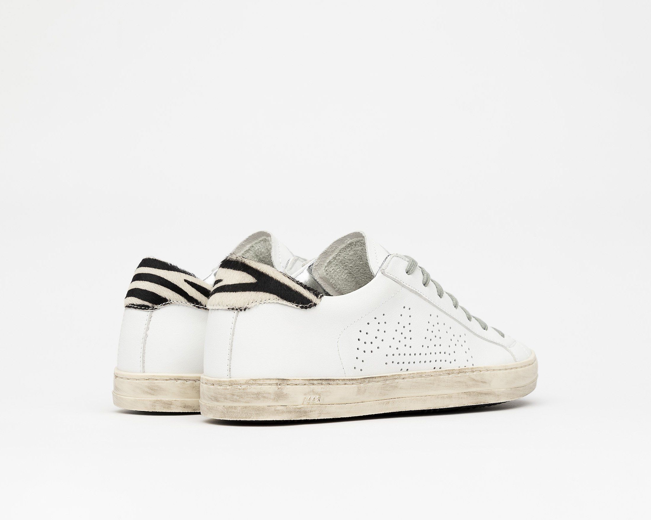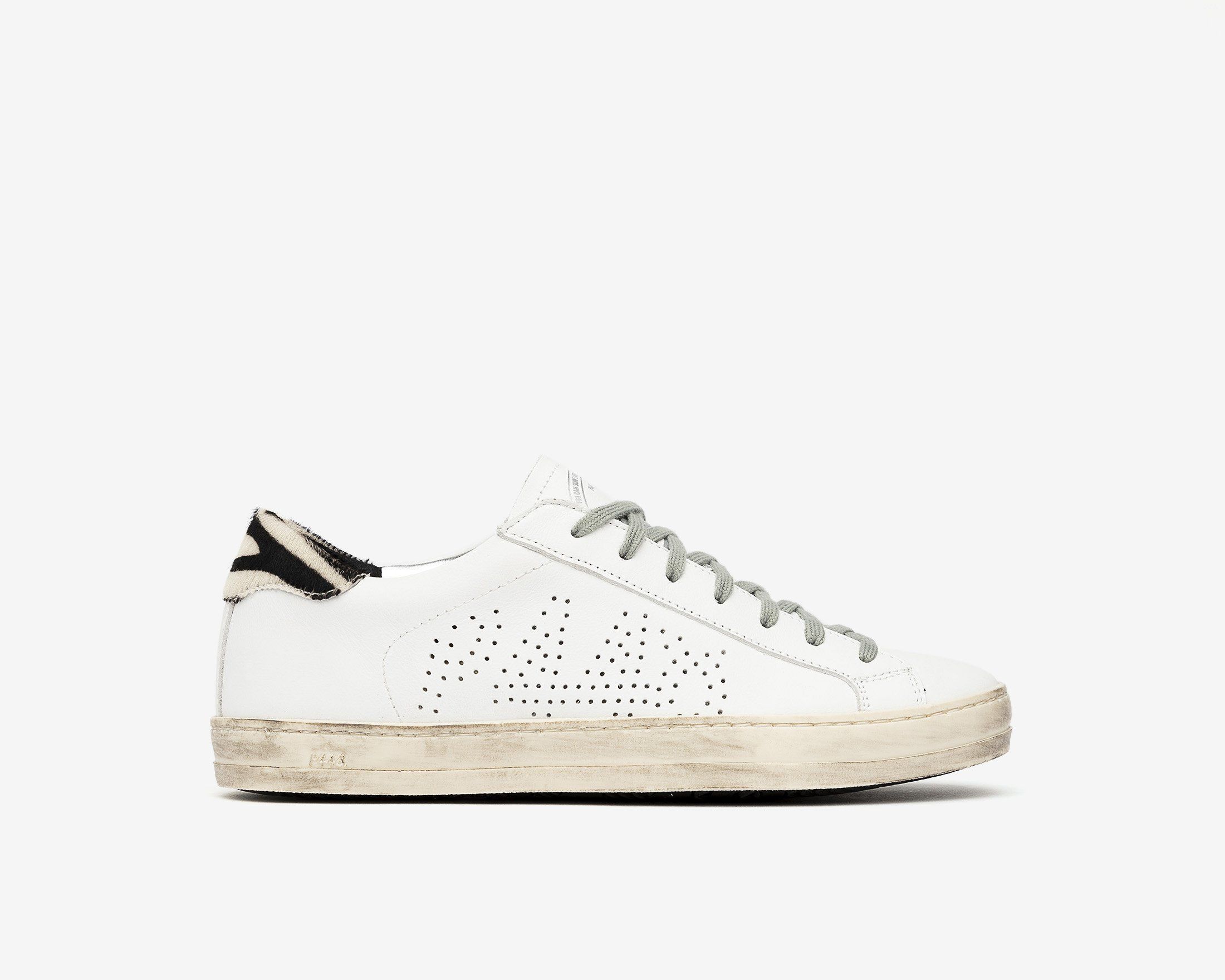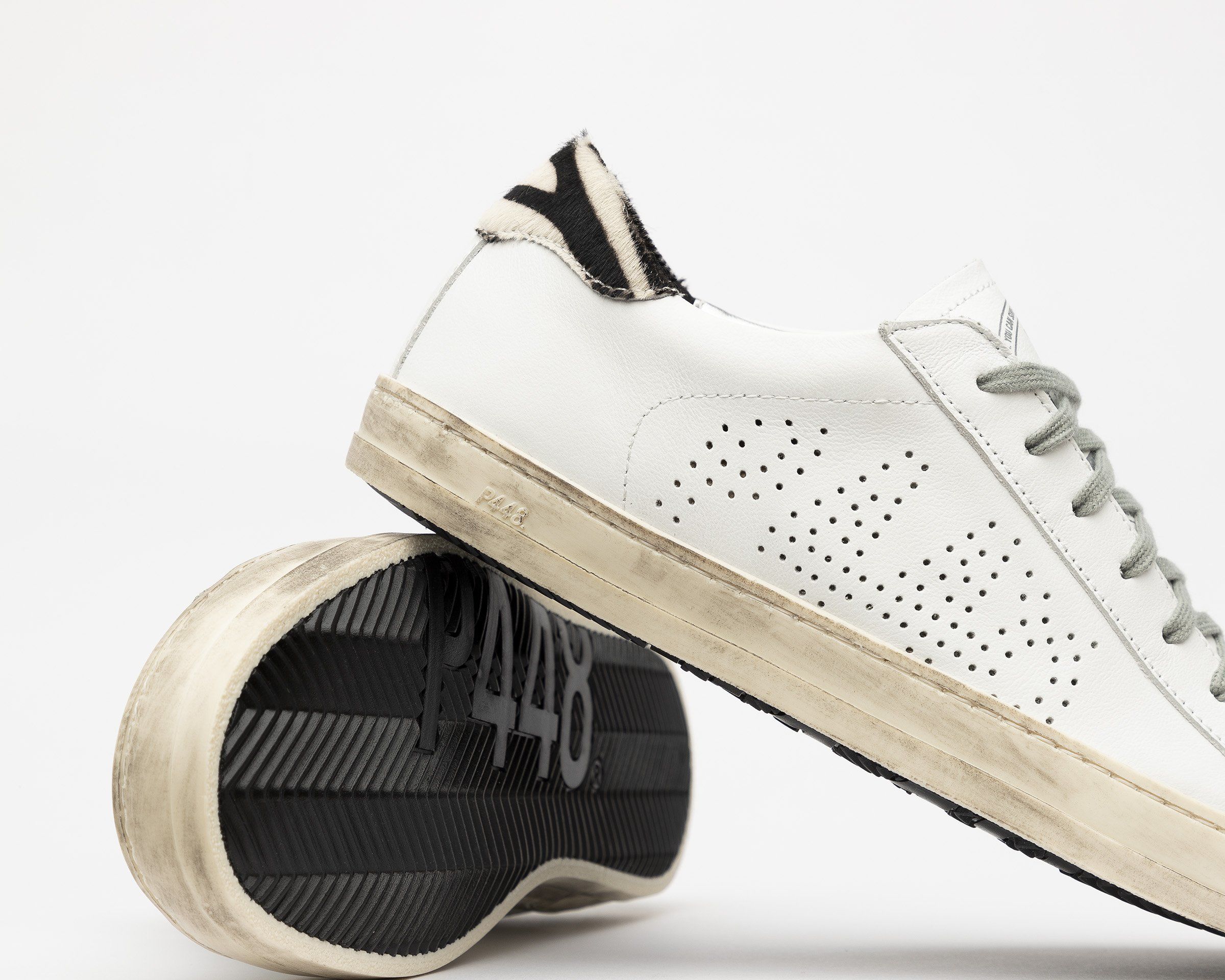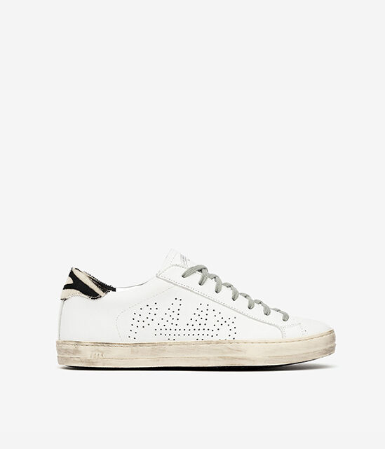 •100%義大利製造 •白色牛皮革,標誌性穿孔P448設計 •黑白斑馬紋 •P448訂製記憶鞋墊 •跟高2.3公分 •正常版型