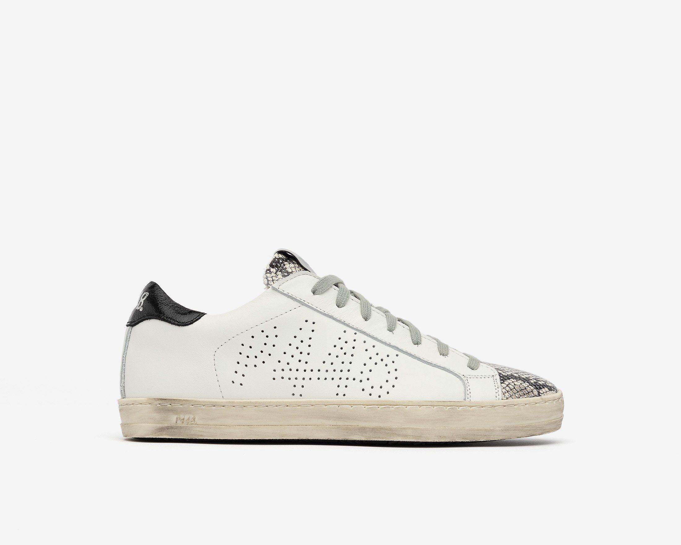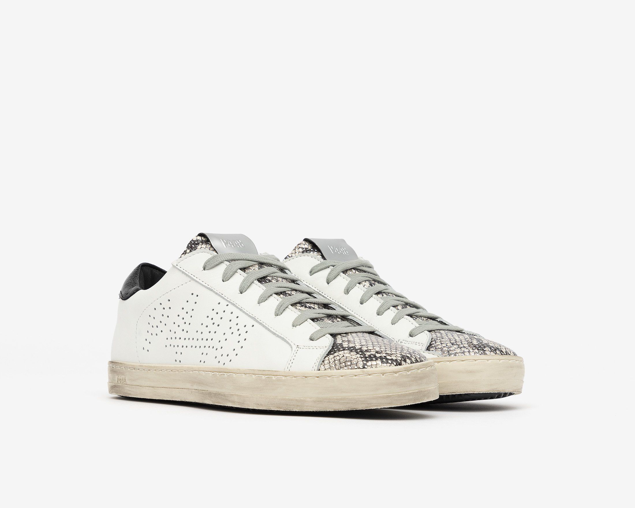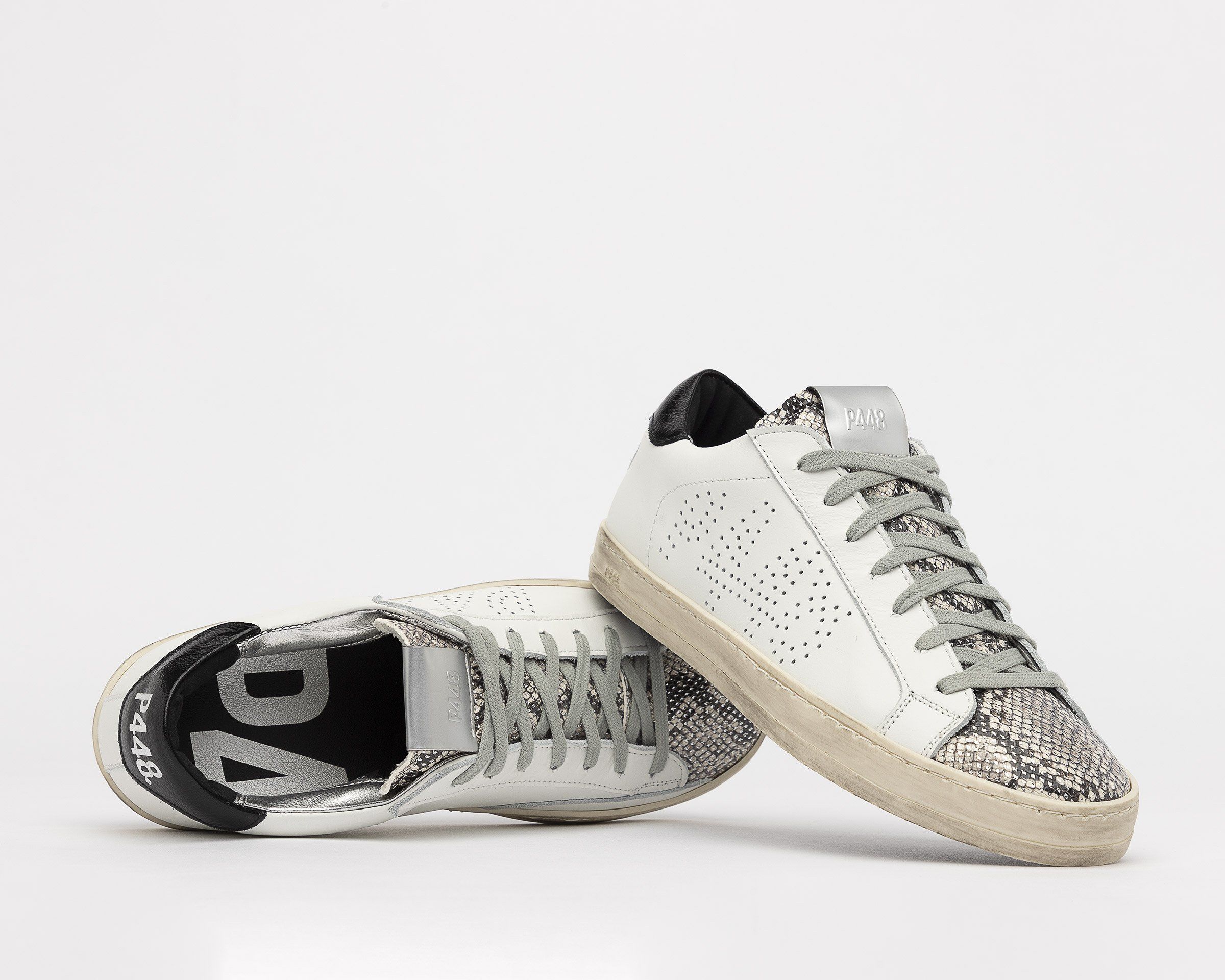 •頂級真牛皮 •銀色蟒蛇皮印花皮革 •黑色品牌皮革後跟 •P448訂製記憶鞋墊 •100%義大利製造 •跟高2.3公分 •正常版型