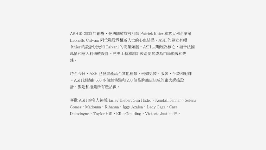 法國出生的 Patrick 是 ASH 背後的心血結晶。 結合自己運動時尚的背景和創新設計以及無可挑剔的工藝,Ithier 憑著世界知名的楔型運動鞋贏得了國際讚譽。 從那時起,他就把 ASH 打造成原創,非凡,舒適的創意鞋類品牌。